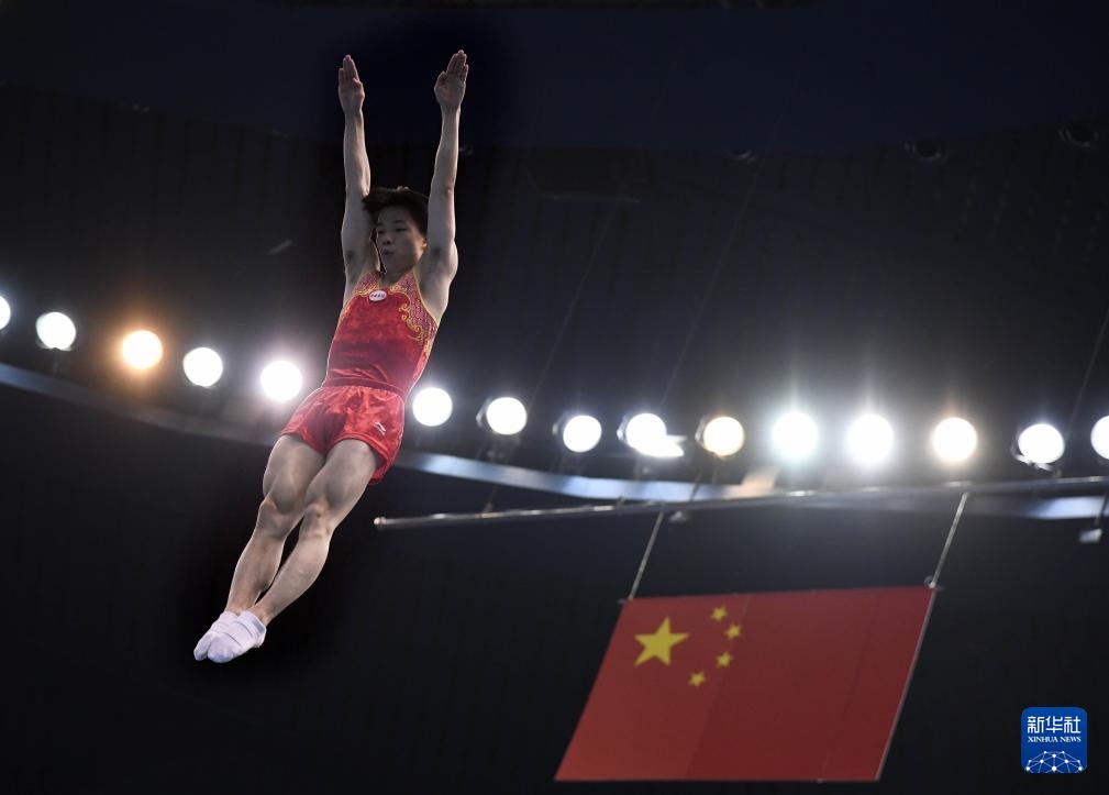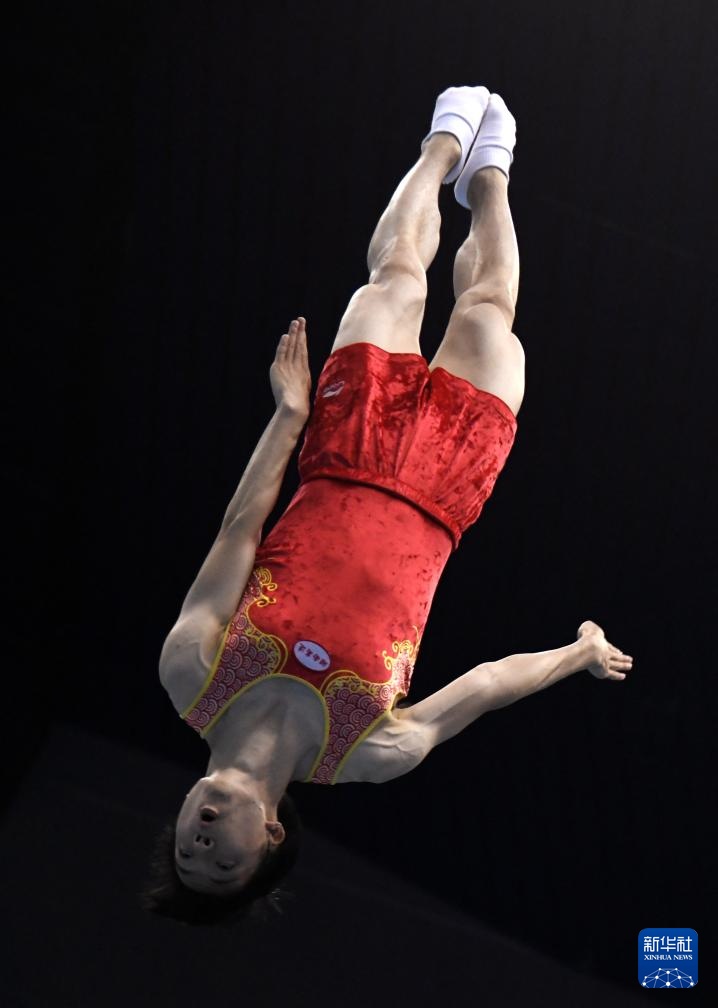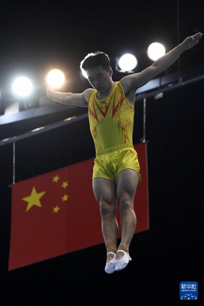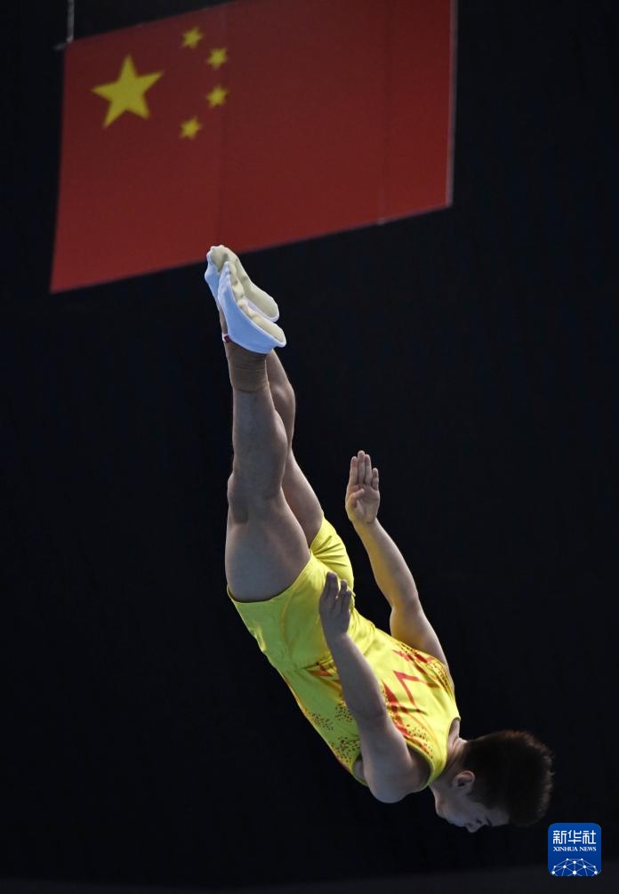 9月5日,江苏队选手王梓赛在男子蹦床个人半决赛中。