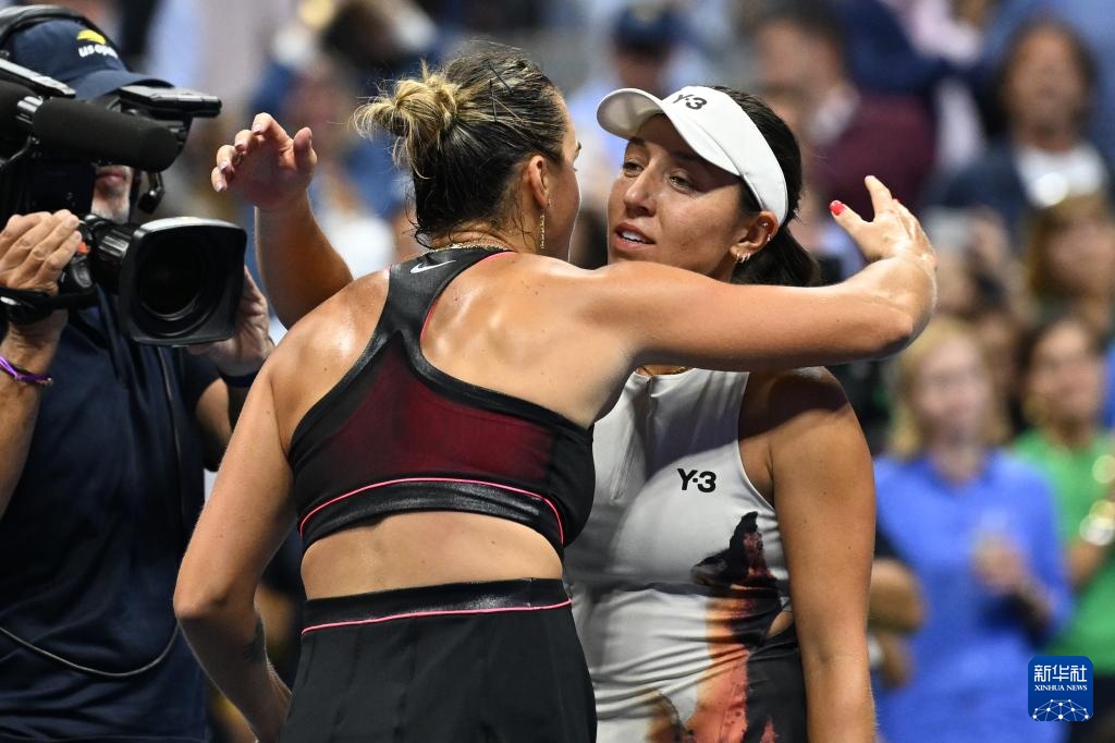 9月4日,萨巴伦卡(左)和佩古拉在比赛后拥抱致意。