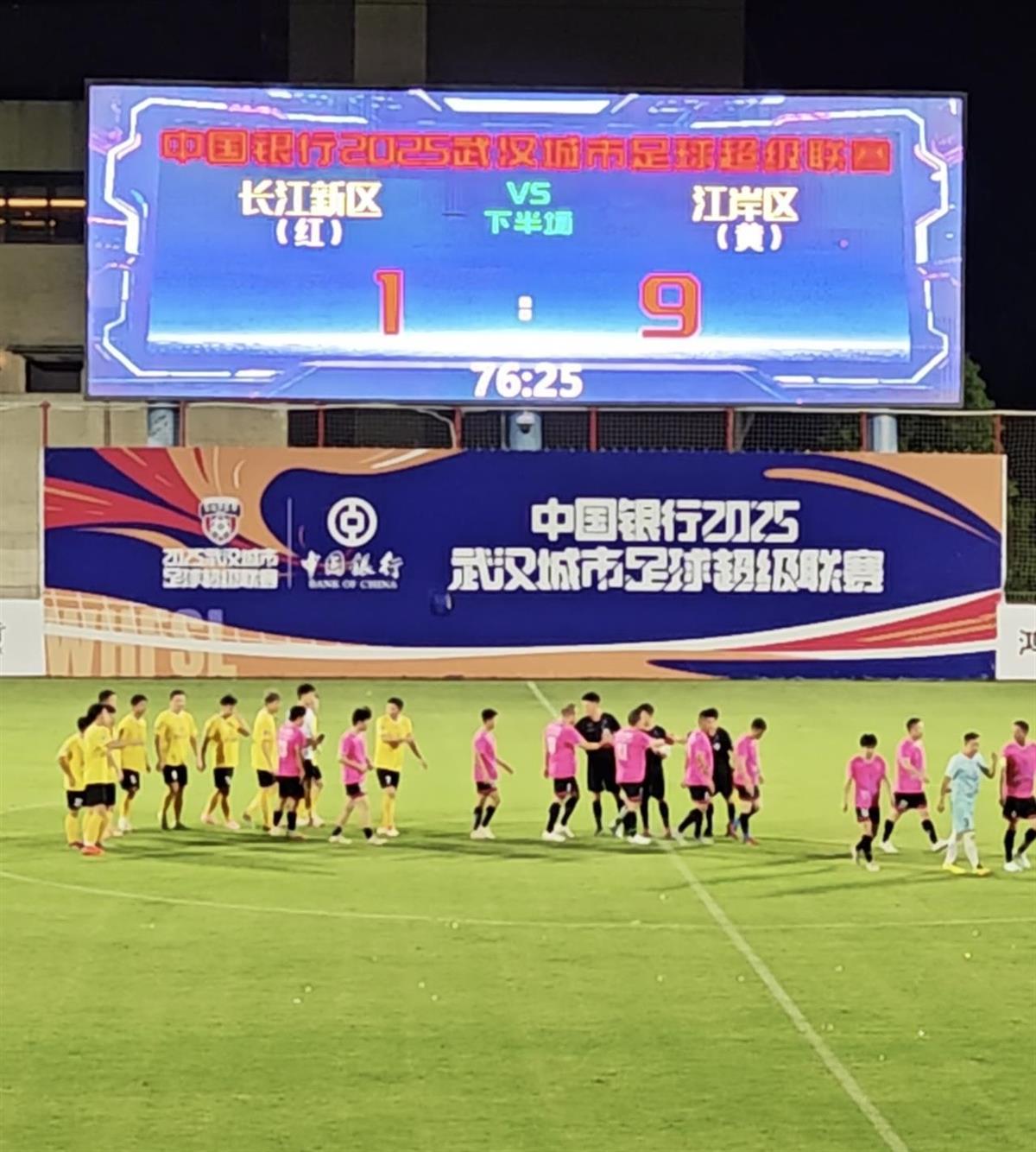 9月6日晚,武汉城市足球超级联赛汉口赛区第四轮赛事打响。长江新区队与江岸区队比赛进行到76分钟时,江岸区队7号打入本队第9球,将场上比分改写为1:9。