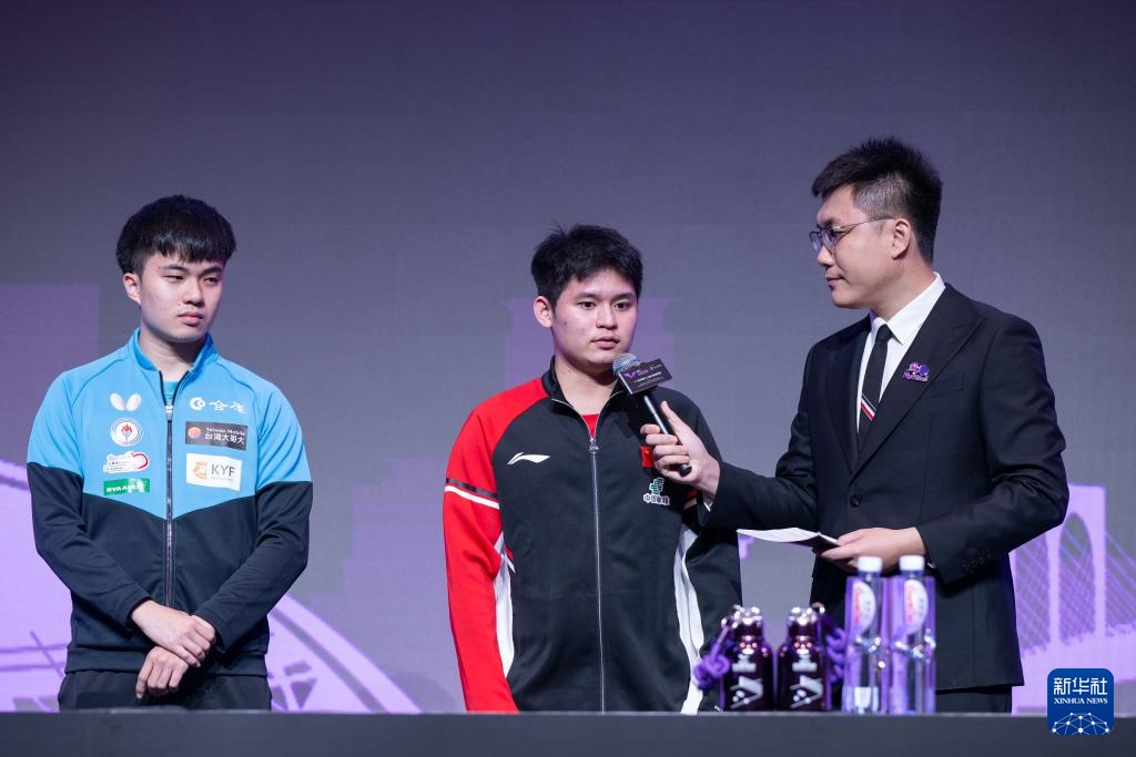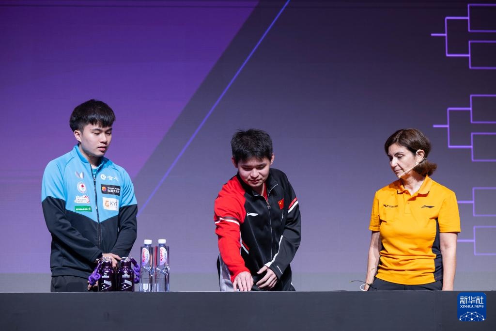 9月7日,中国选手林诗栋(中)、中国台北选手林昀儒(左)在抽签仪式上。