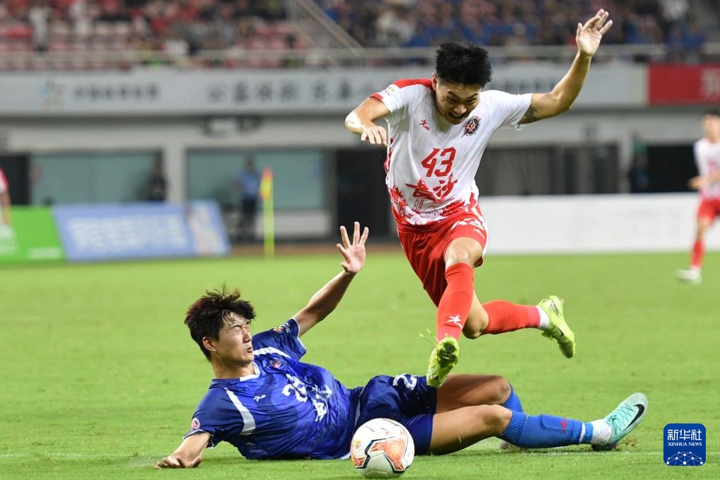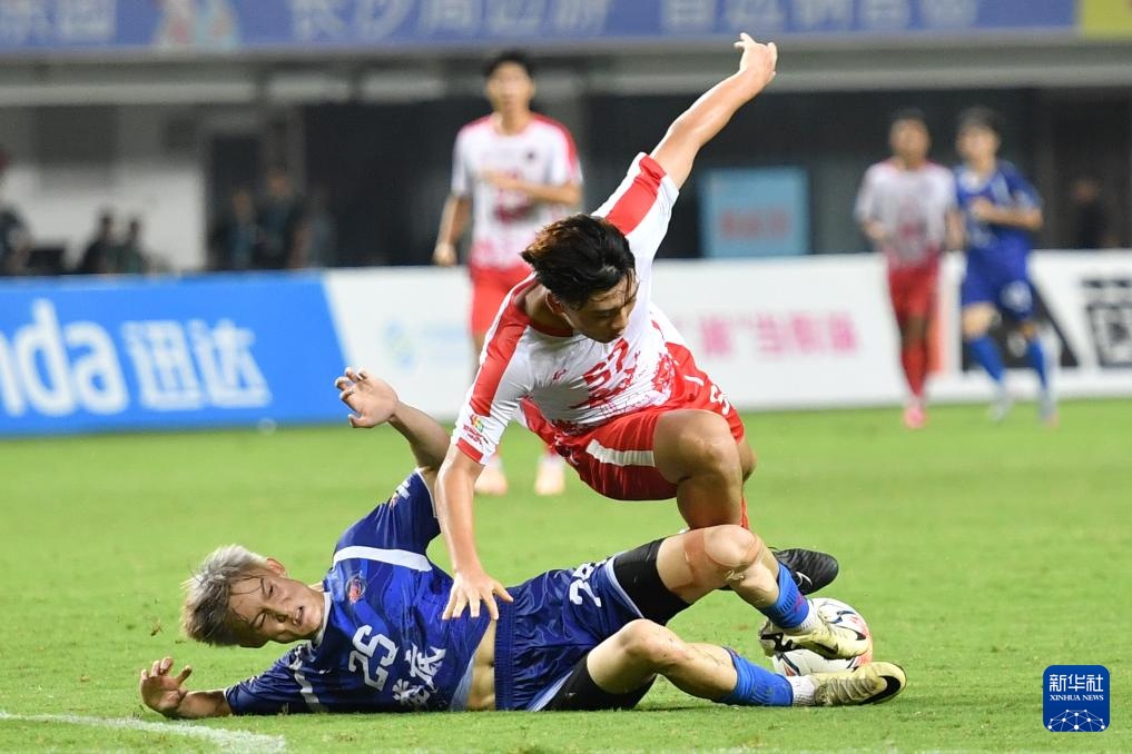 9月7日,娄底队球员孙绮(左)与长沙队球员肖劲光在揭幕战中拼抢。