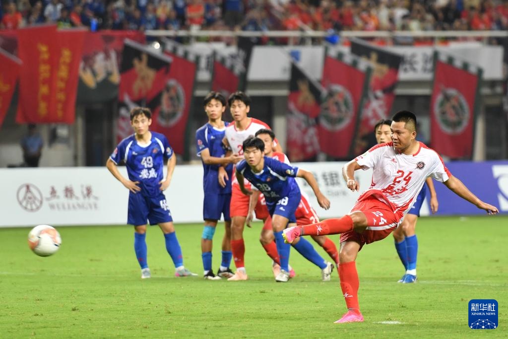 9月7日,长沙队球员杨柯(前)在揭幕战中主罚点球命中。