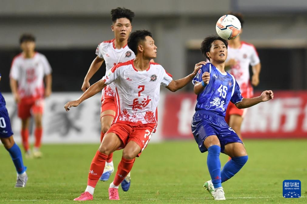 9月7日,长沙队球员林泽浩(右)在揭幕战对阵娄底队的比赛中拼抢。