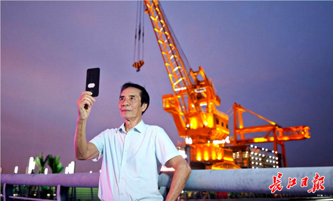 “这江滩啊,就是一本记录了我家几代人生活变迁的老相册!”在青山江滩的生态缓坡上,80岁的胡昇老人用手机拍摄江景,他身后锈红色的龙门吊艺术装置,与绿意盎然的生态草溪形成奇妙对话。