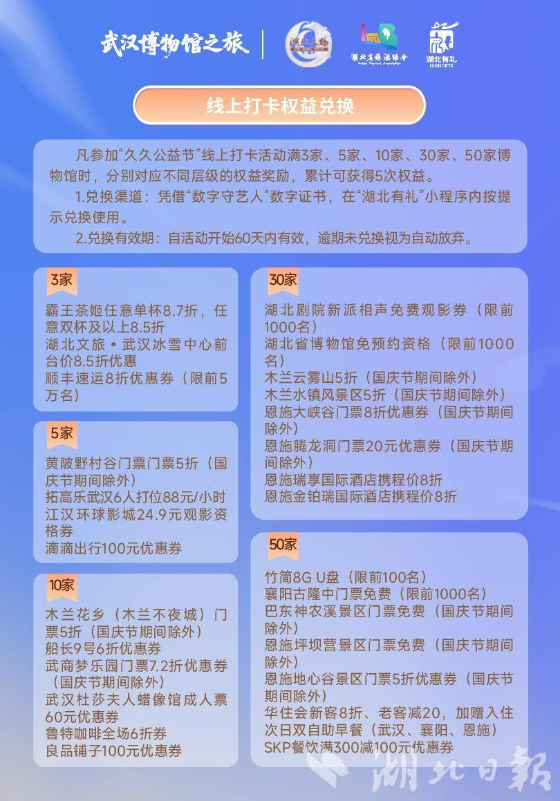 为提振文旅消费升级,实现文化传播与旅游经济的双向赋能,全新上线的“湖北有礼”平台为参与者准备了专属权益福利,打卡的博物馆,分别设置不同的权益奖励,涵盖“吃、住、行、游、购、娱”等多个领域,进一步激发观众的参与感。