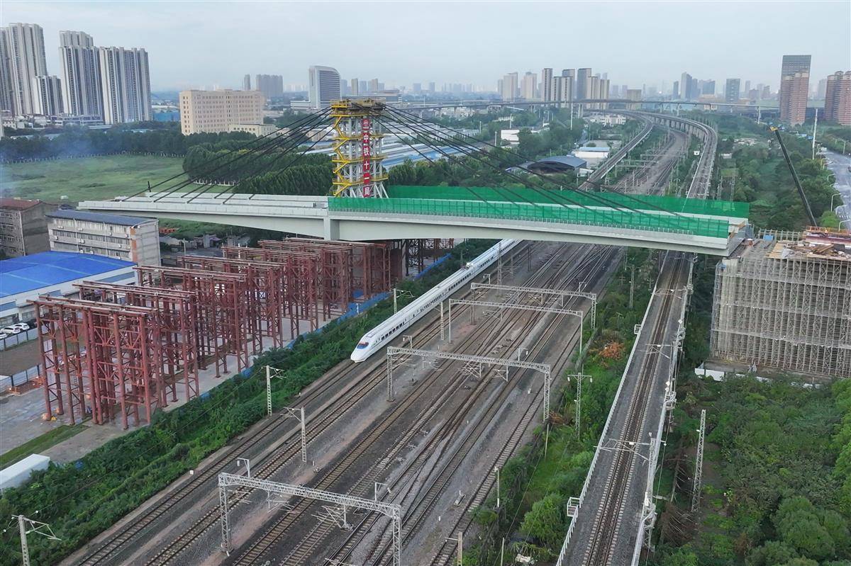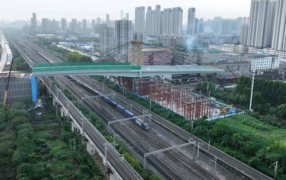 转体桥施工区域环境复杂。邻近高压输电线、弱电、燃气、通信等各种管线,桥梁跨沪蓉、汉丹等8股繁忙铁路干线,日均通行列车超200列。桥体与铁路接触网最近距离仅1.193米,安全风险突出,管控难度极大。