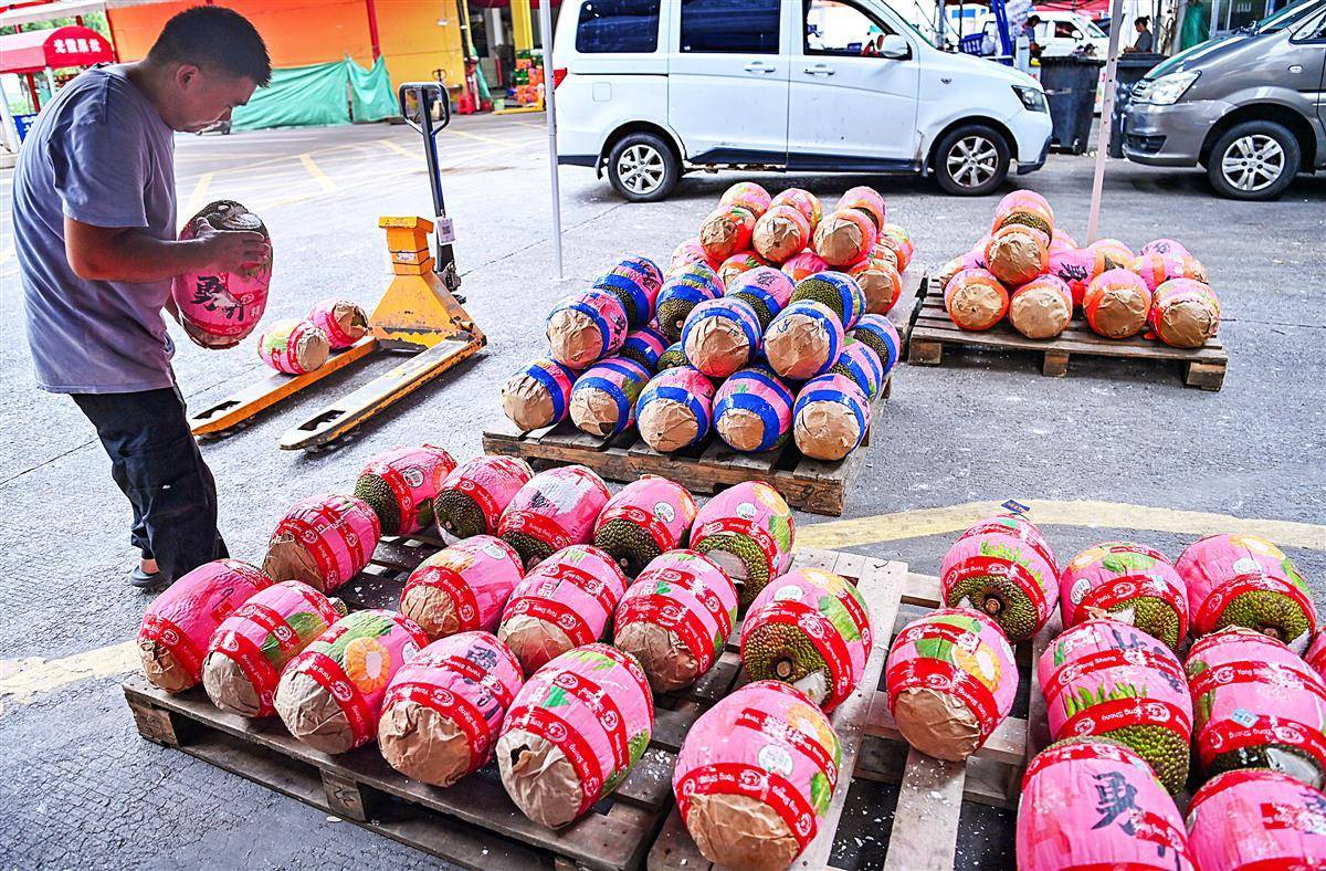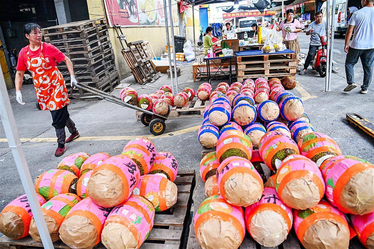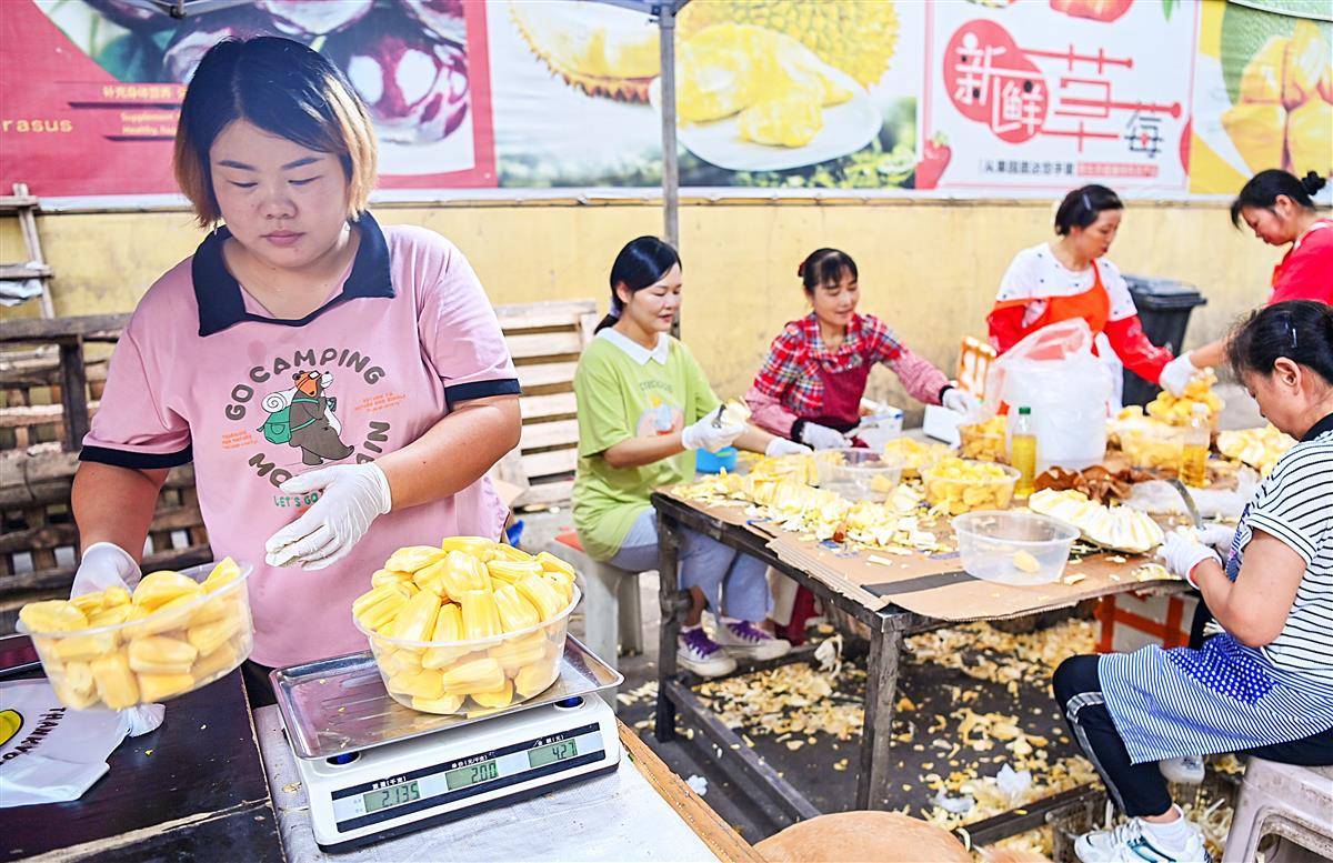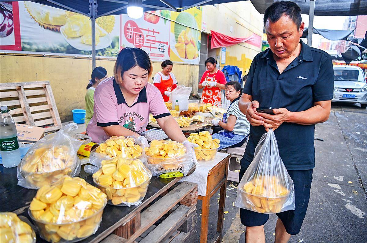 9月10日上午,位于武汉白沙洲的湖北光霞果批大市场内,某果行内堆放着许多从越南进口来的菠萝蜜,6名工作人员正在把一个个完整的菠萝蜜解体,现剥出菠萝蜜肉来批发,黄肉的50元一大盒,前来批发的消费者络绎不绝。据了解,目前正是越南菠萝蜜上市的季节,整个的批发价每斤5元左右,较去年价格有所降低,现剥现卖比整个好销。(湖北日报全媒记者 朱熙勇 摄)