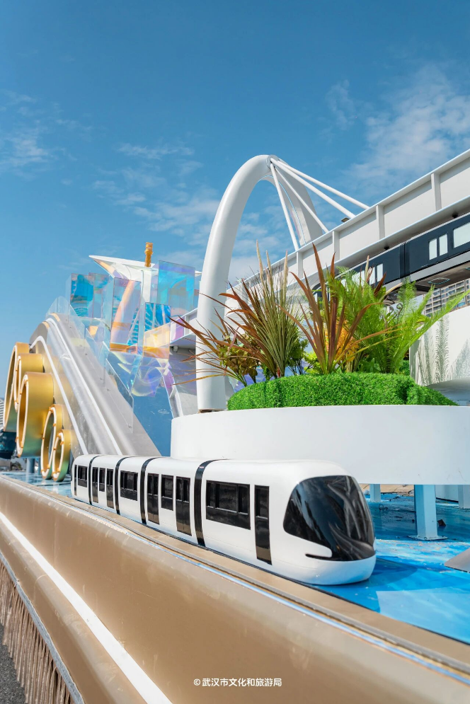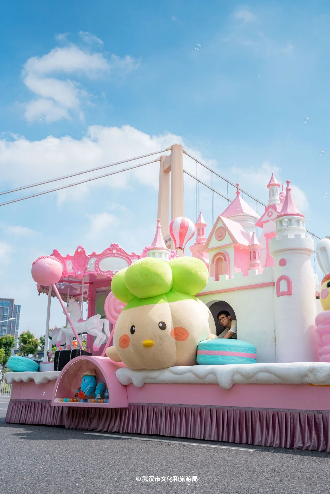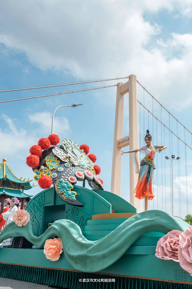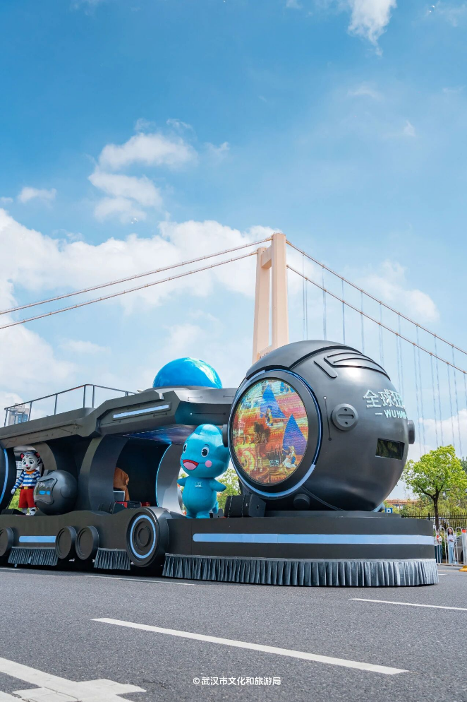 花车与演艺团队组成6大IP方阵,织就多元文化长卷。“河山锦绣”以《千里江山图》为蓝本,金龙穿梭、长城蜿蜒间,带来“车行画动”的沉浸式体验;“初心如磐”精准复刻嘉兴红船,将红船精神与武汉“敢为人先”的城市基因无缝串联;“楚风汉韵”以黄鹤楼为背景,凤凰展翅的主体造型搭配编钟、虎座鸟架鼓等楚文化符号,演员演绎先秦乐舞,尽显荆楚文明磅礴灵动的独特魅力;“非遗国潮”花车以高饱和色调提炼戏曲盔头、非遗纹样,敦煌飞天演员高空起舞,尽显传统之美;“动漫萌宠”用马卡龙色系与摩天轮造型营造欢乐氛围,长江江豚IP“豚宝”环绕车身,3D全息投影让哪吒、葫芦娃等国漫角色“活”跃眼前;“全球狂欢”则凭借旋转地球仪与LED屏流动画卷,生动传递“地球村”的开放愿景。