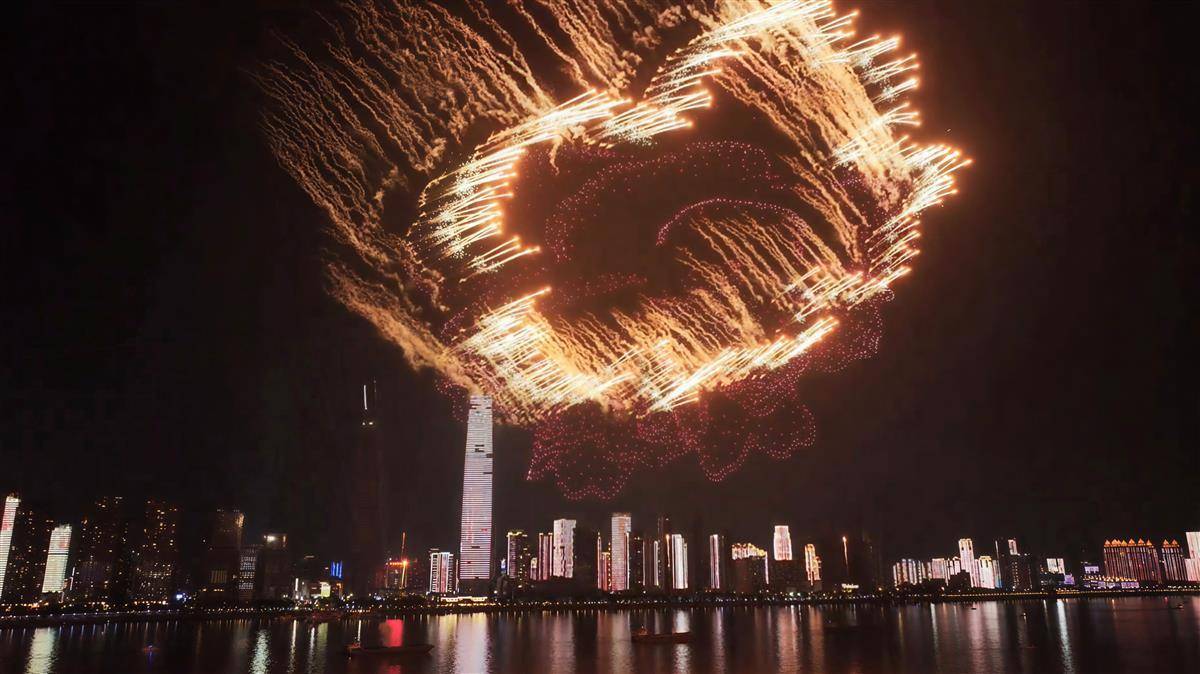 尤为独特的是,智能无人机编队与新型冷烟花实现了前所未有的融合。4000架无人机在天空织就璀璨星河与动态画卷,就在观众沉浸其中时,绚丽的冷烟花于无人机的流光线条间悄然绽放,带来虚实交织、动静相宜的奇幻视觉体验。(湖北日报全媒记者 陈少哲 摄)