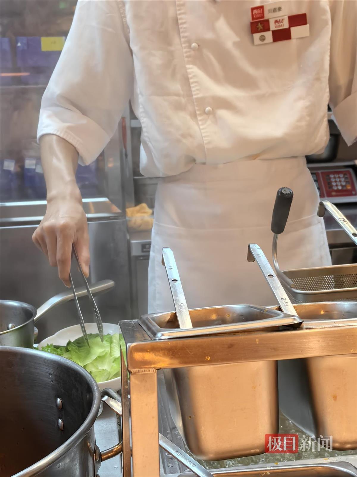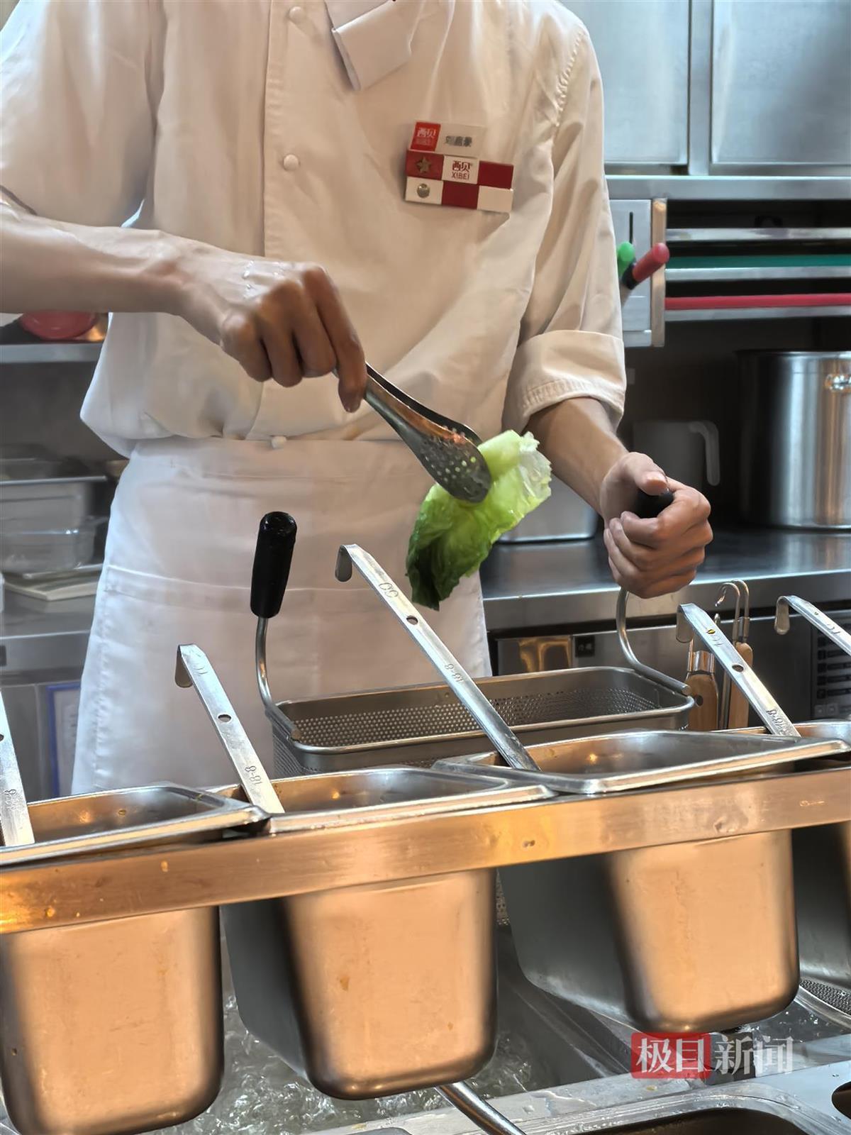 在制作葱油罗马生菜的区域,极目新闻记者看到,身穿白色工作服的男子拿出一袋生菜,放进不锈钢篓子里,然后在开水中烫了烫,用筷子夹起放入盘中,浇上调料,然后端上桌。