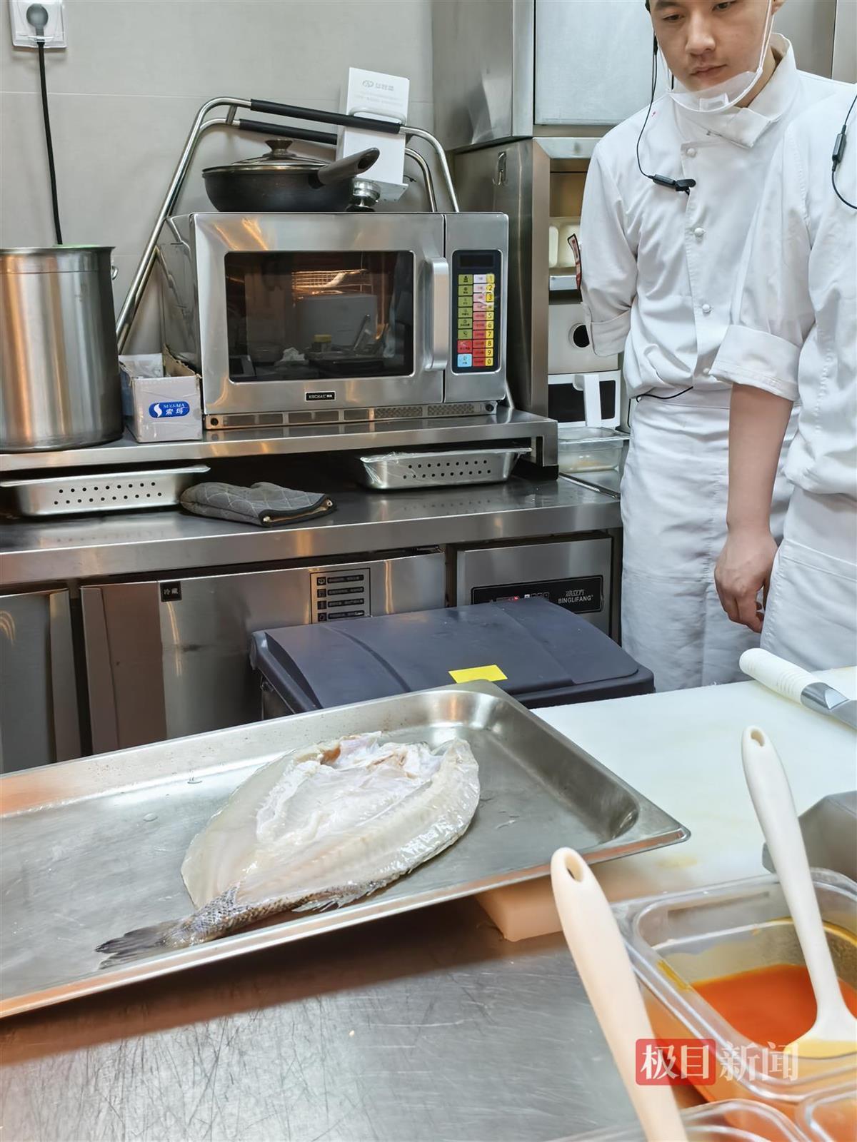 在烤鱼制作区,一名身穿白色工作服的男子从储物柜中拿出一条早已宰杀好的鱼,放进盘子里,放上调料,然后放进烤箱里烤制。