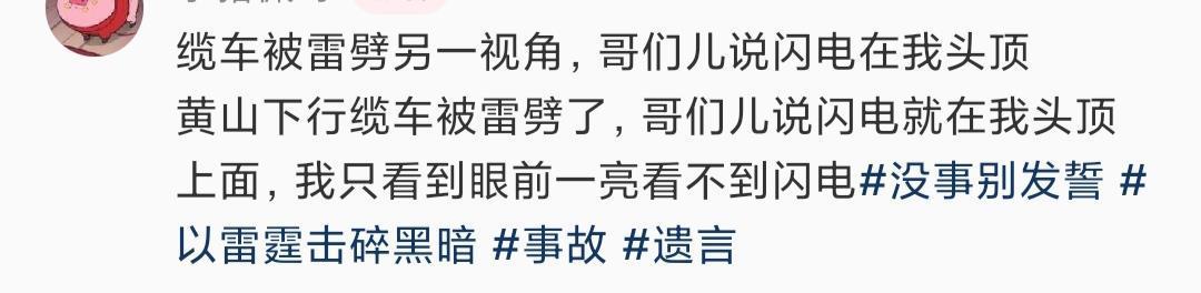 游客在视频中称,“缆车被雷劈了,吊厢在剧烈摇晃,人都吓尿了。”据这位游客在评论区的回复,他是11日下午4时40分许乘缆车下山。另一位乘坐缆车的游客也发视频称缆车停了,他当时只看到“眼前一亮”。视频还显示,这几位游客最终安全下山。