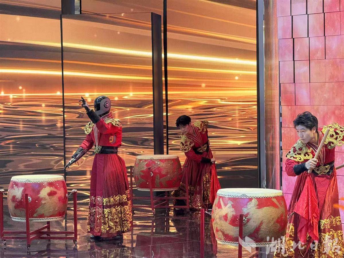 在武汉展区,5台由光谷东智公司打造的人形机器人,与专业舞蹈演员联手再现今年春晚武汉分会场备受赞誉的“凤凰舞”。机器人身披火红荆楚服饰,流畅完成击鼓、太极等颇具难度的舞蹈动作,动作整齐划一,情感表达饱满,引来大批观众层层围观。