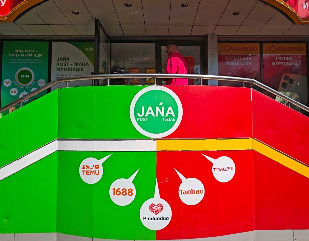 这是9月3日在哈萨克斯坦阿拉木图一家主要负责中国网购平台物流服务的快递网点外拍摄的宣传标识。(新华社记者李任滋摄)