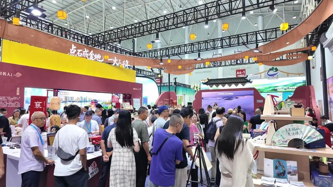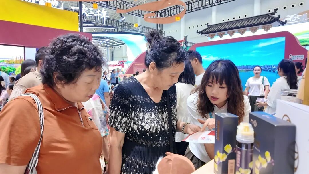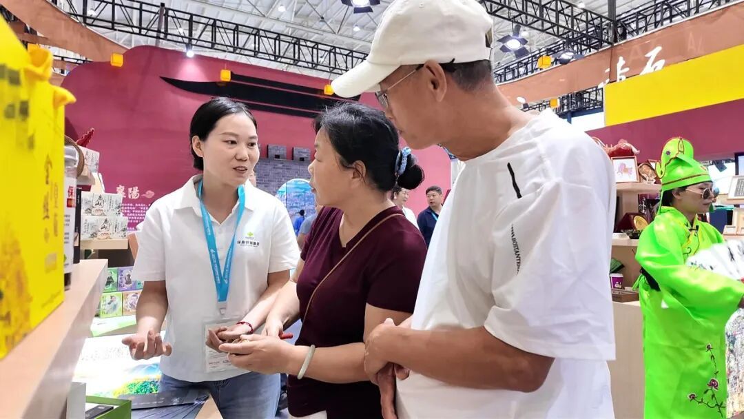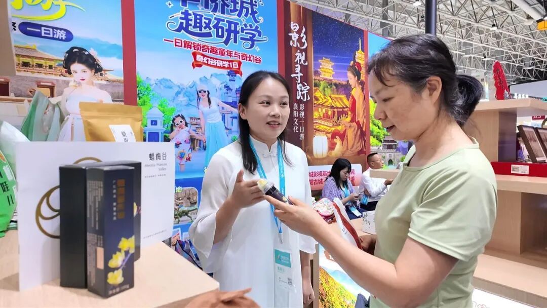 保康展区内,各类文创产品和特色物产琳琅满目。核桃、葛粉、炸胡椒等农特产品散发着淳朴地道气息,蓝莓酒、蜡梅雪梨膏、金丝皇菊等精选好物以及文创折扇、手提包和精美的旅游线路手册陈列有序,引得不少客商与游客驻足咨询、选购。