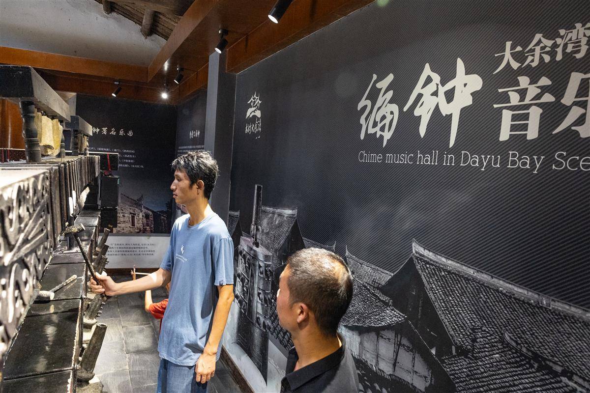 2025年9月10日,市民游客在黄陂大余湾民居内,体验编钟文化。(湖北日报全媒记者 倪娜 摄)