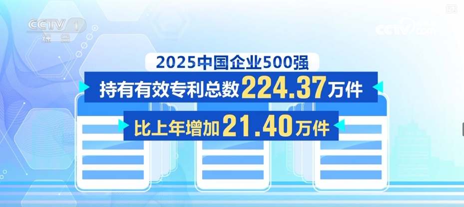 2025中国企业500强持有有效专利总数224.37万件,比上年增加了21.40万件。其中,发明专利占全部专利的46.33%,发明专利数量连续6年保持增长,比上年提高了2.50个百分点,专利质量明显提升。