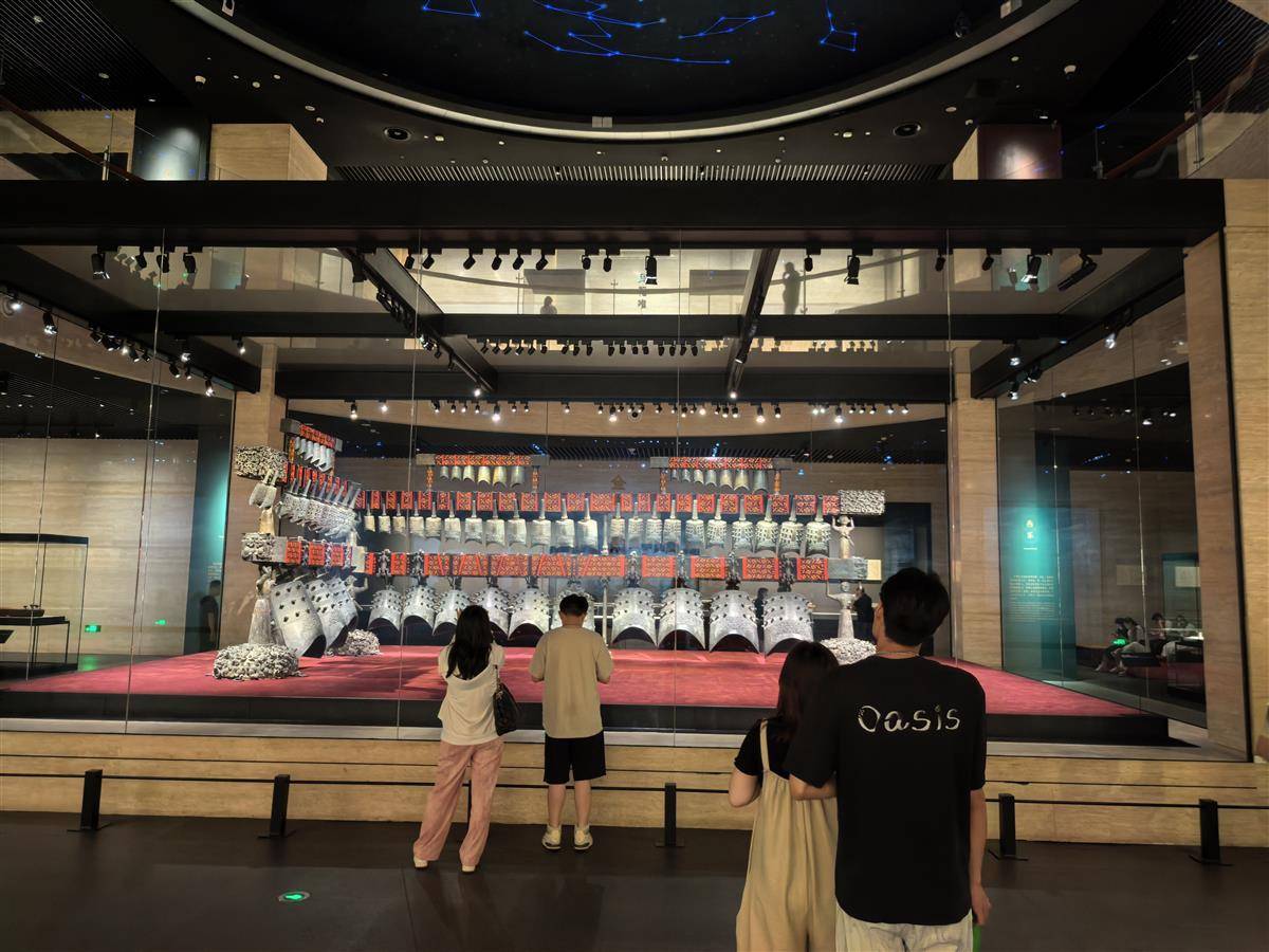 自当日起,湖北省博物馆正式推出夜游模式,每月 17 日将延长开放时间,夜游时段从 17:00 持续至 20:30。傍晚时分,展厅内柔和的灯光缓缓亮起,照亮了一件件珍贵的文物。在曾侯乙编钟展厅,游客们驻足观赏,有的举起手机拍摄编钟在灯光下的精美纹饰,有的侧耳倾听工作人员讲解编钟背后的历史故事,偶尔还能听到游客之间轻声交流的赞叹声。夜游模式的开启,为广大游客提供了全新的文化体验机会。夜幕下,文物仿佛被赋予了新的生命力,游客们在轻松的氛围中领略历史文物的独特魅力,感受荆楚文化的深厚底蕴。(湖北日报全媒记者 刘曙松 摄)