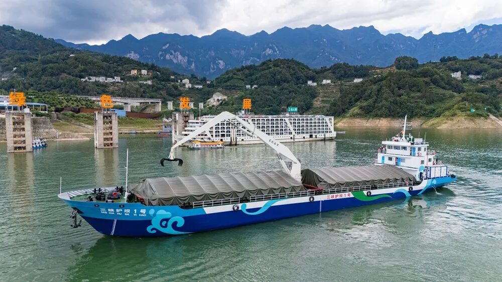 8月20日,国内首艘4E级纯电动清漂转运船“三峡护坝1号”在三峡库区水域试航。(彭强 摄)