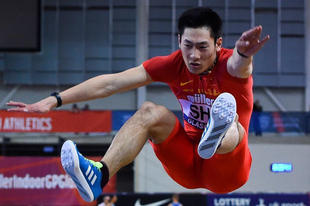 2018年2月25日,石雨豪在比赛中。当日,在2018国际田联室内巡回赛格拉斯哥站男子跳远比赛中,中国选手石雨豪以8米13的成绩夺得冠军。新华社法新