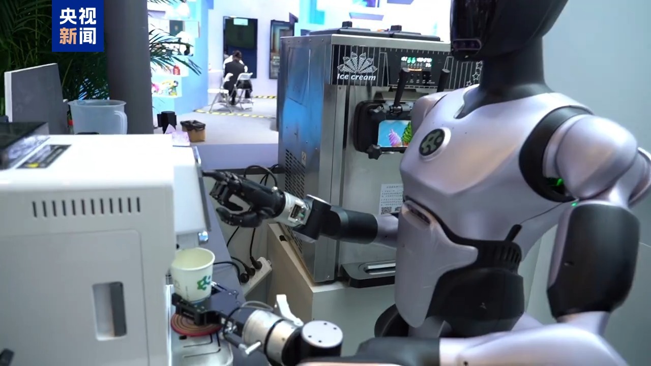 逛累了,还可以来一杯由机器人制作的咖啡,听一首由机器人赛博鼓手奏乐的广西民歌《大地飞歌》。