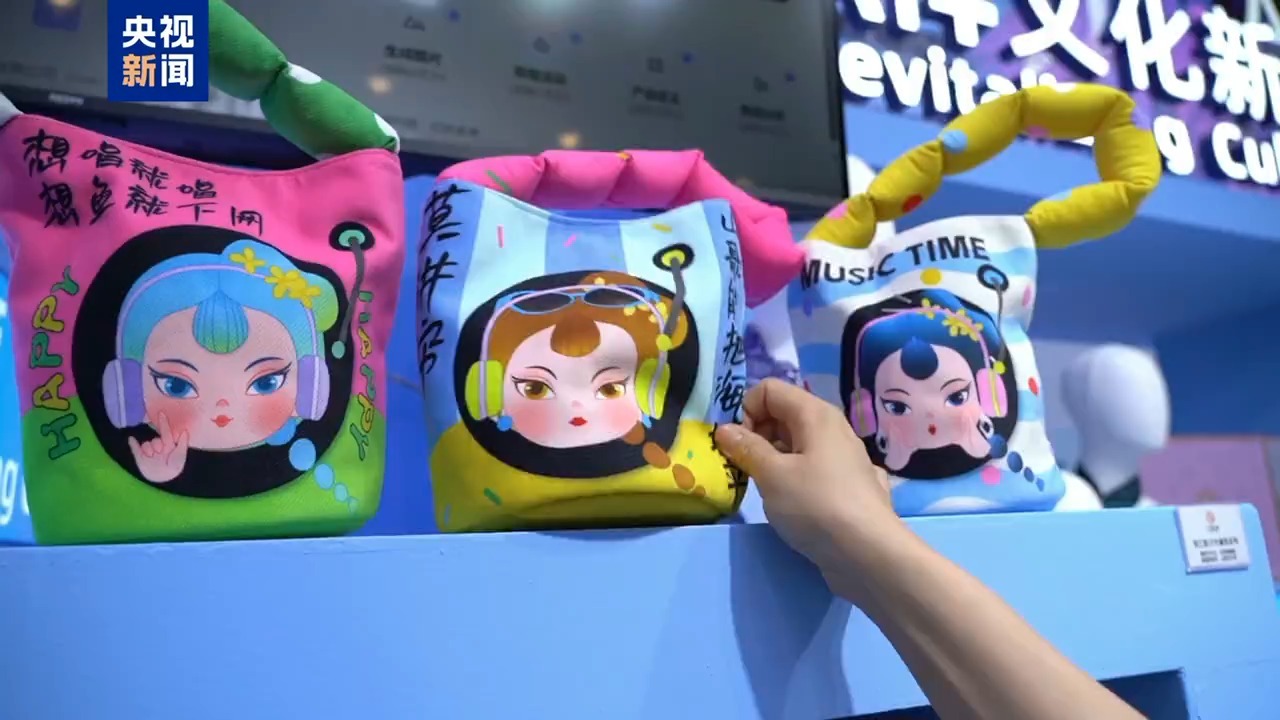 总台央视记者 张歆:在人工智能专馆,除了有炫酷的机器人,我们可以看到,这个水桶包就是由人工智能提供灵感的,以刘三姐为IP形象的文创产品。那么这个水桶包还引用了刘三姐山歌的内容,“山歌能把海填平”。