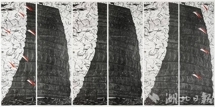 西南大学美术学院教授戴政生常年跋涉和创作于长江三峡流域,经长期构思,他选择风帆作为画面主旋律符号,创作了高3米,长20多米乃至60米的套色版画《回忆长江》。他说,创作这件超大木刻版画时,常处于亢奋之中,这些巨型风帆似刀削陡峭的三峡峰峦,似巴渝山民锋利的砍刀,是艺术之帆,也是自己的精神源泉。