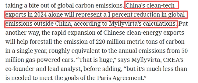 根据米利维尔塔的计算,仅2024年中国出口的清洁技术就意味着一年内能阻止2.2亿吨碳的排放,约相当于5000万辆燃油车一年的排放量。文章认为,这意味着,中国清洁能源相关出口已经削弱了全球碳排放。