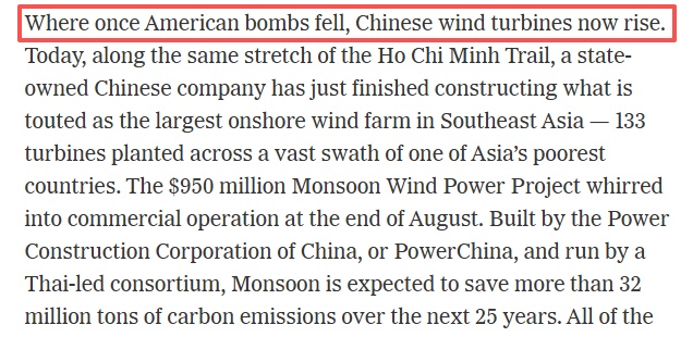 “在美国的炸弹曾经落下的地方,竖起了中国风机”。