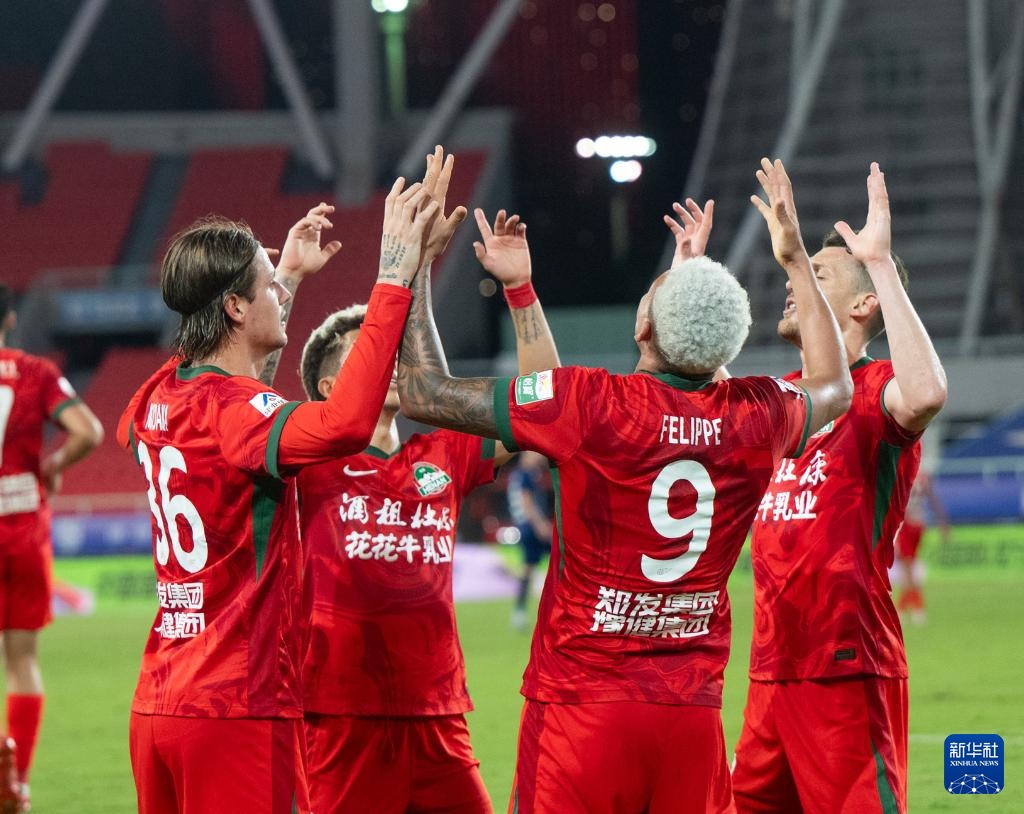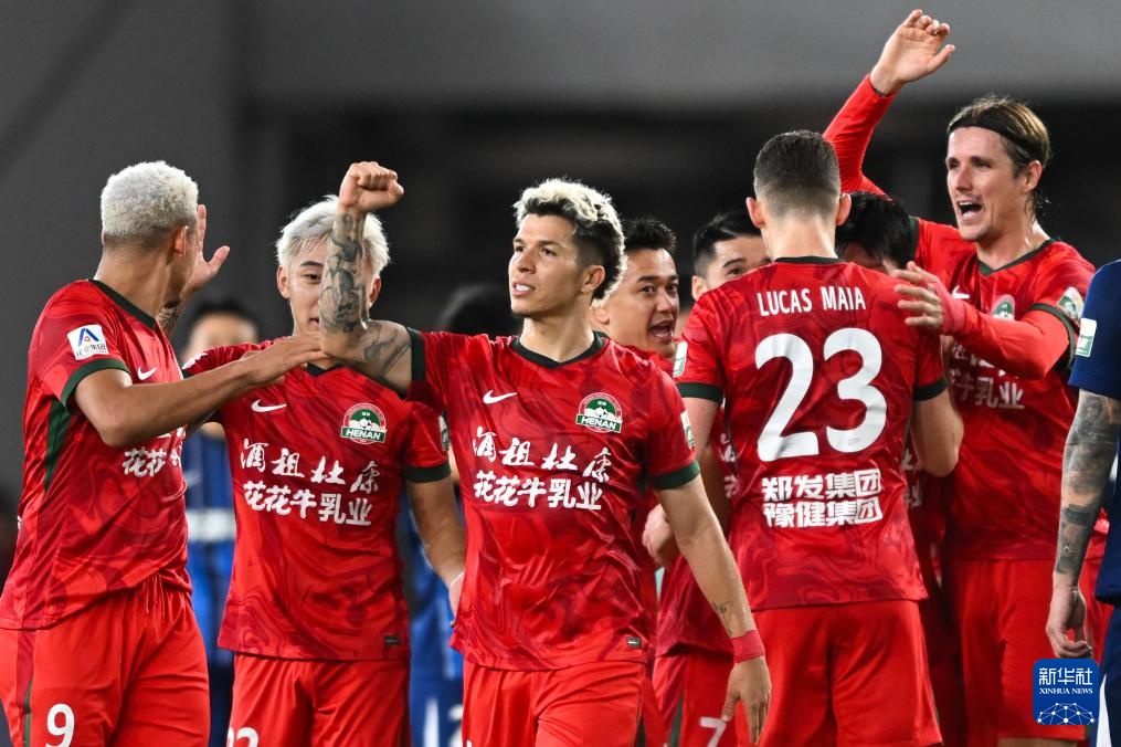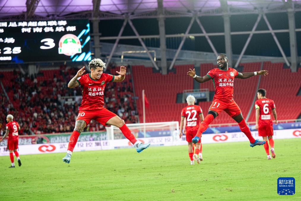 9月19日,河南俱乐部酒祖杜康队球员费利佩·卡多索(右二)在进球后与队友庆祝。