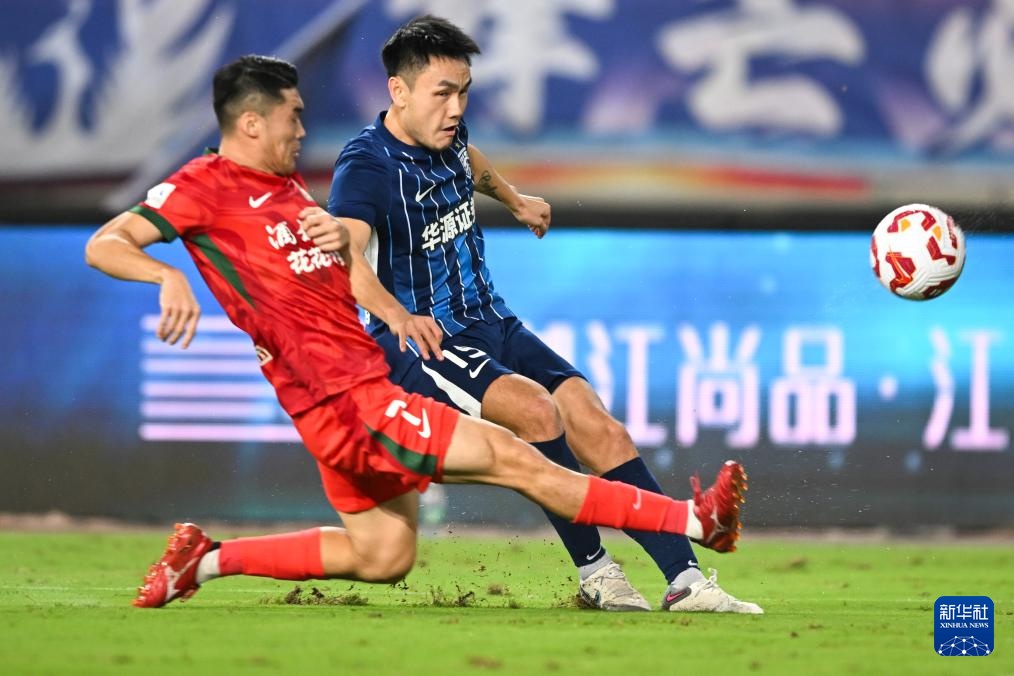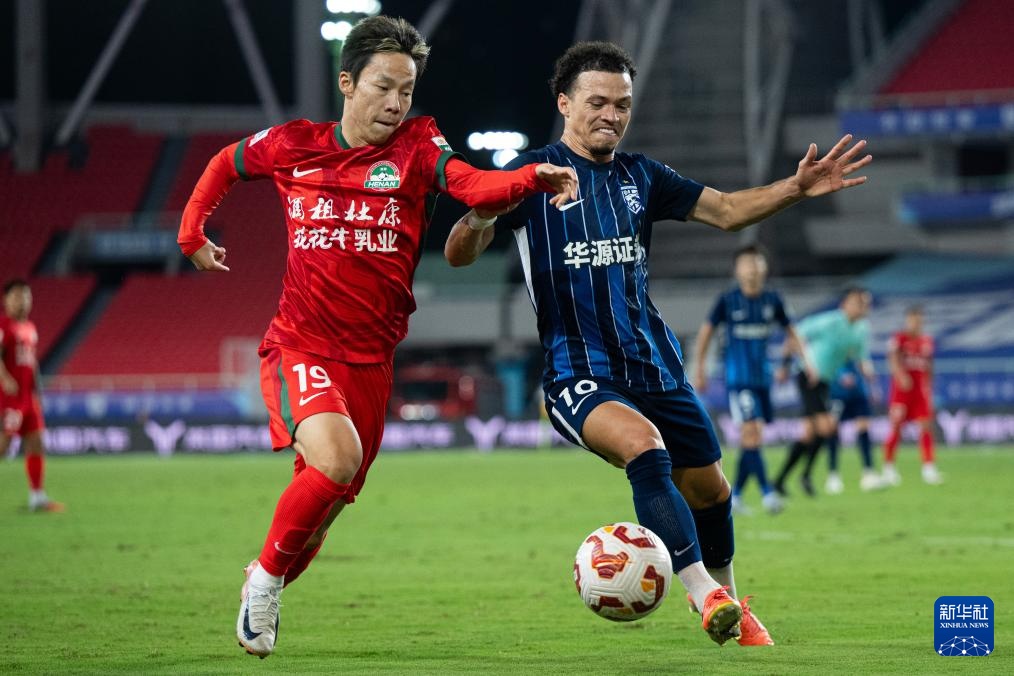9月19日,河南俱乐部酒祖杜康队球员钟义浩在比赛中阻截武汉三镇队球员陈哲超(右)的传球。