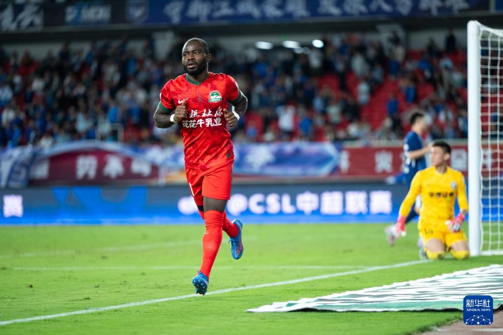9月19日,河南俱乐部酒祖杜康队球员阿奇姆彭破门后庆祝。