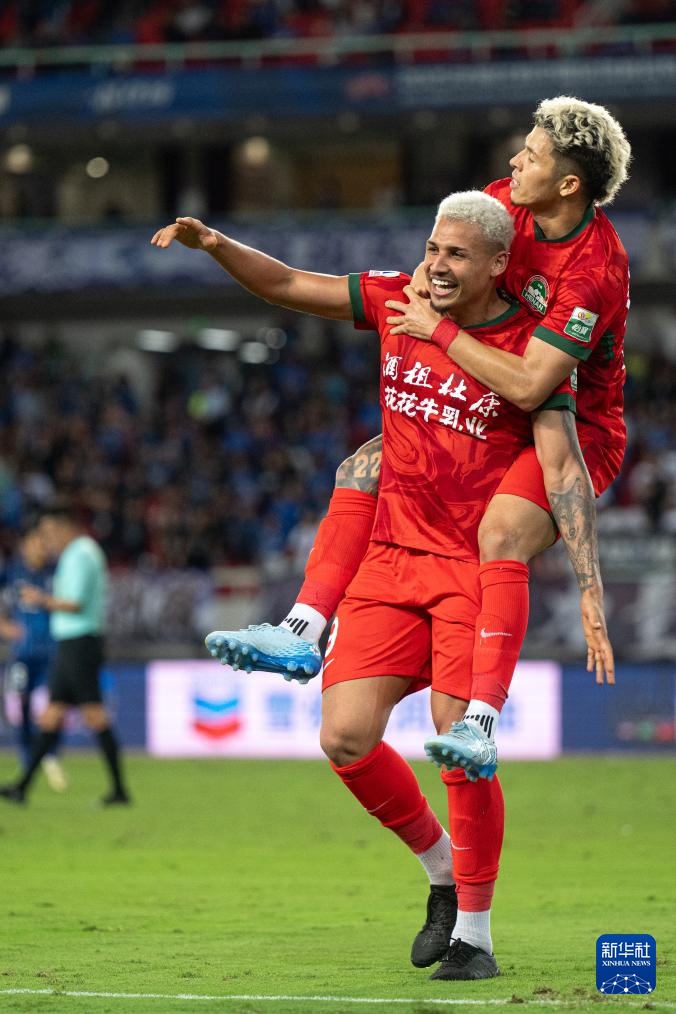9月19日,武汉三镇队球员达兰(右)在进球后与队友朴志洙庆祝。
