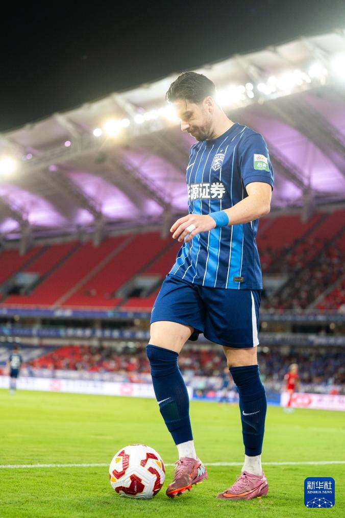 9月19日,武汉三镇队球员绍尔准备发角球。