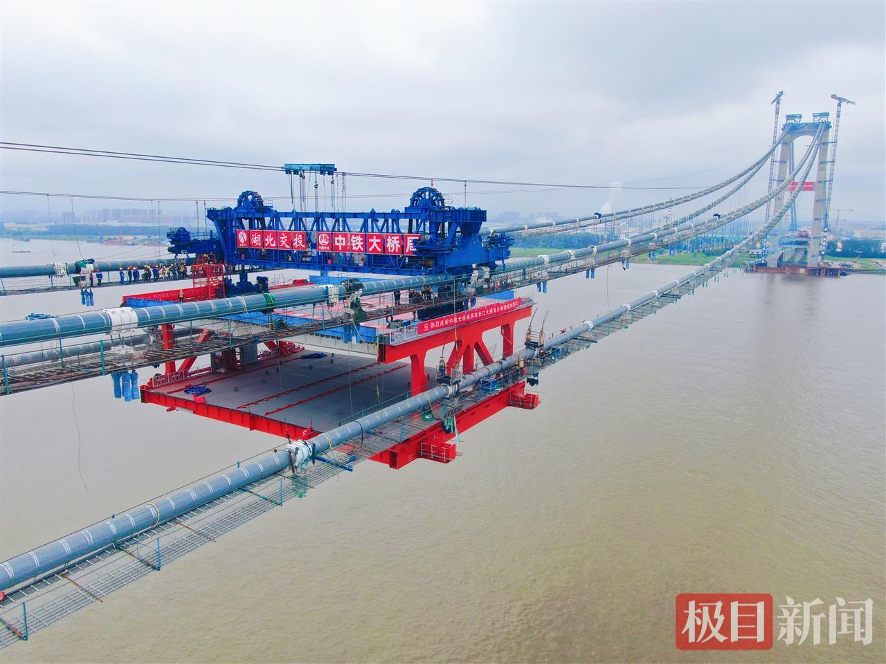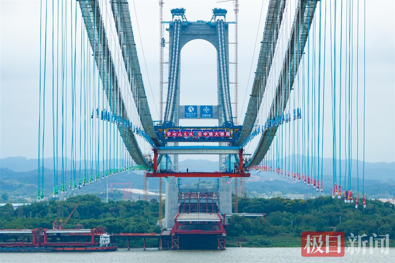 为攻克不同垂度四主缆悬索桥的结构体系难题,湖北交投集团牵头联合中铁大桥局等参建单位,前期开展数百次数据论证与可行性实验,反复优化施工方案,最终精准确认各安装点位,创新采用“外缆安装液压提升装置+钢梁底部吊点连接”的施工方法实现“力的转换”,并搭建实时测算系统,通过动态监测钢梁各位置受力变化,随时调整校正,确保内外缆受力始终平衡,成功破解架设难题。