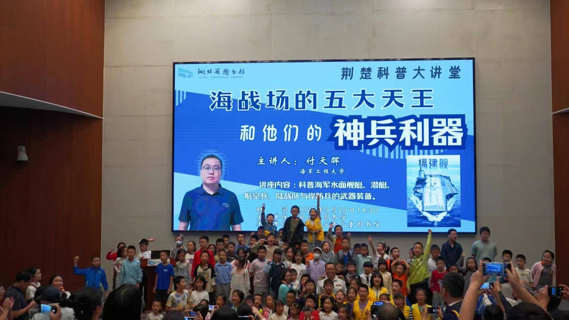湖北日报讯 (记者王晶、通讯员朱嫏嬛)9月20日,童之趣·荆楚科普大讲堂在湖北省图书馆汉江报告厅开讲。海军工程大学电子工程学院付天晖教授分享了《逐梦深海 向海图强——海战场的神兵利器》,吸引300余名小读者与家长踊跃参与。