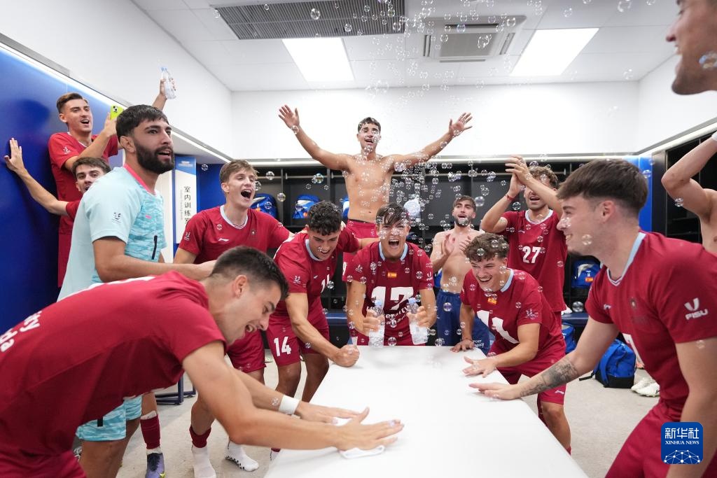 9月20日,格拉纳达大学男足球员赛后在更衣室庆祝。