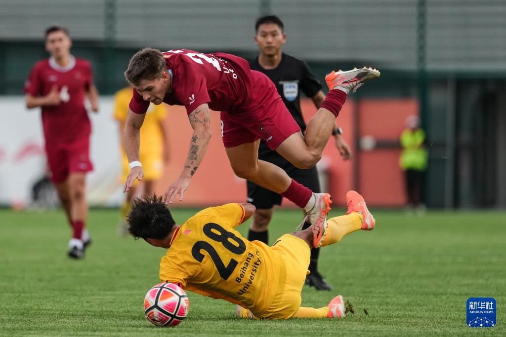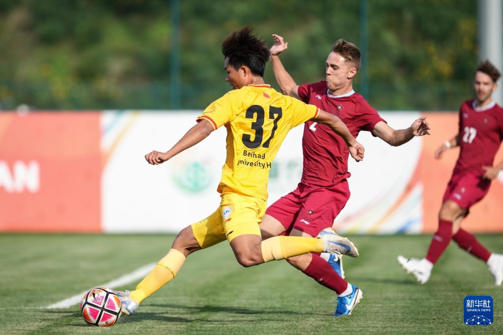 9月20日,北京航空航天大学球员程曦阳(右)在比赛中破门。