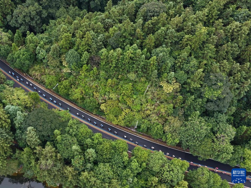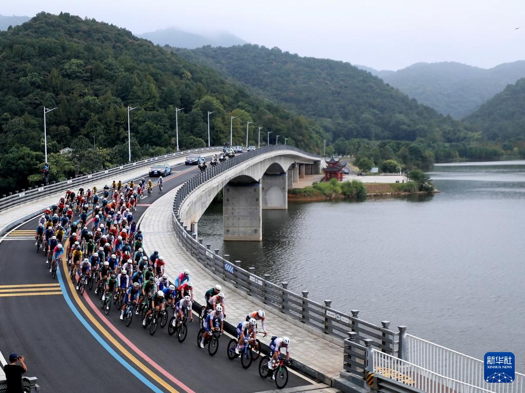 9月20日,参赛选手在比赛中骑行(无人机照片)。