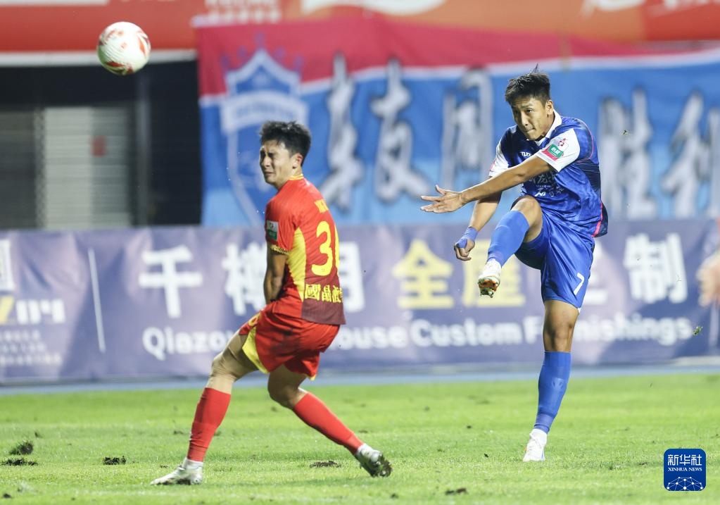 9月20日,石家庄功夫队球员刘子铭(右)在比赛中射门。