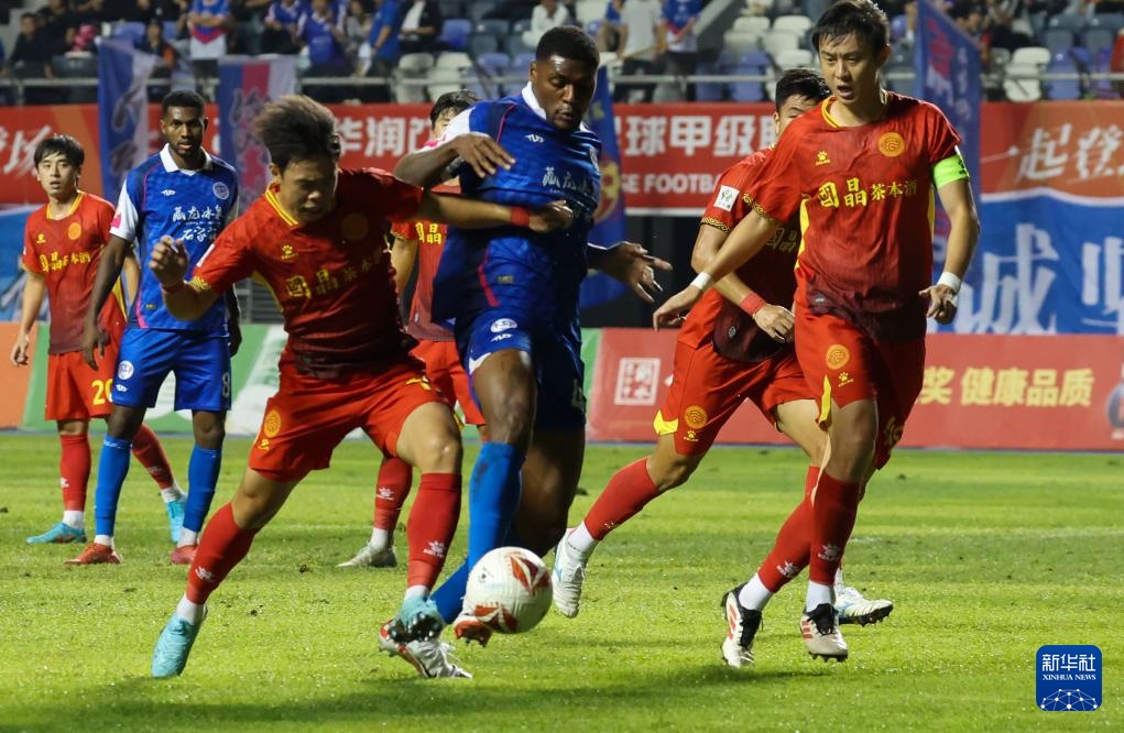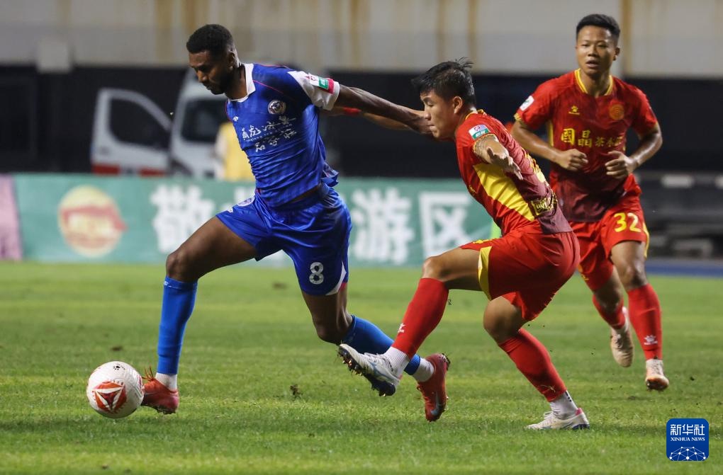 9月20日,广西平果国晶队球员向荣峻(前右)在比赛中拼抢。