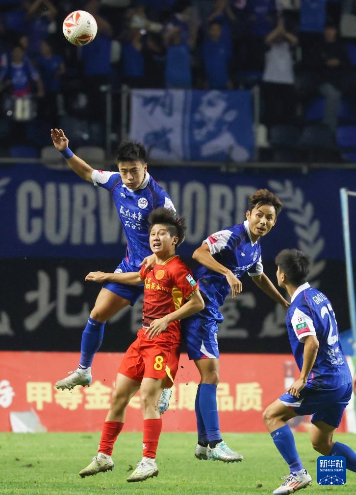 9月20日,石家庄功夫队球员徐俊驰(左一)在比赛中争顶。