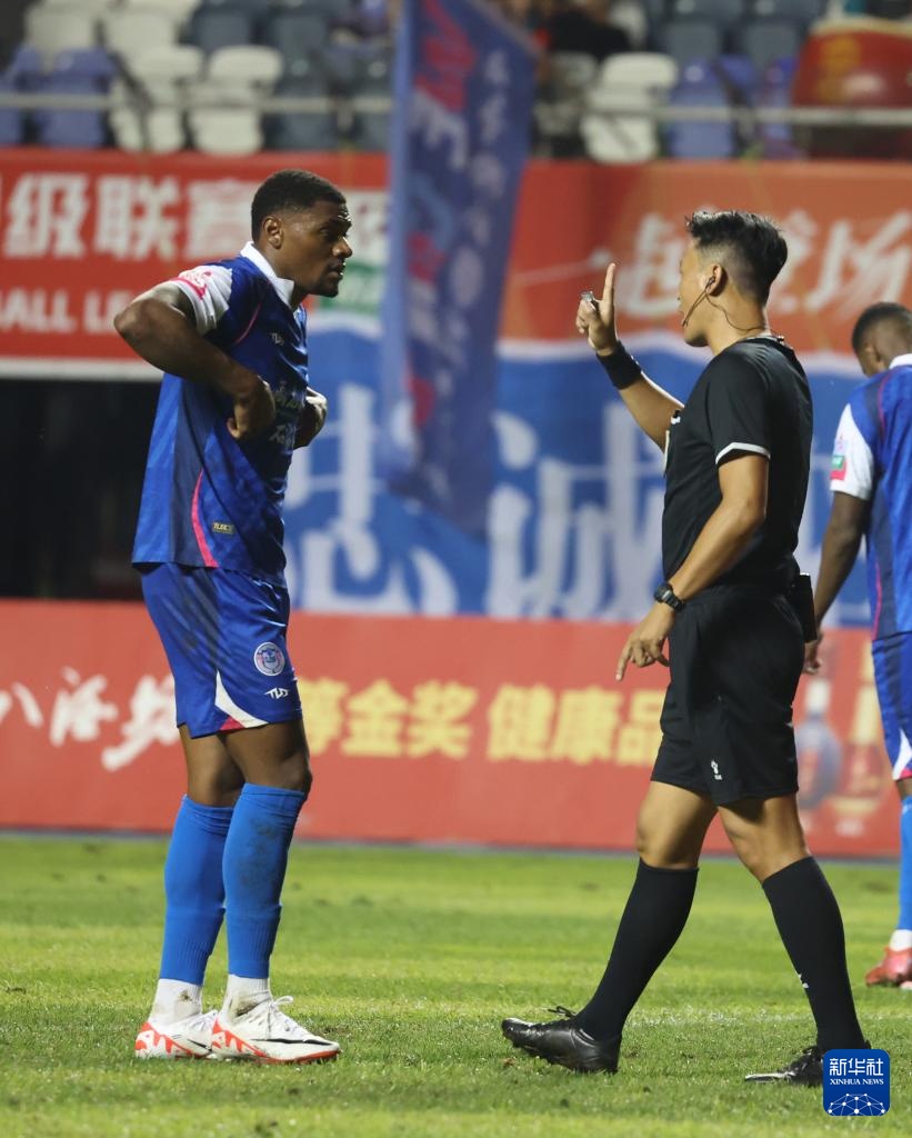 9月20日,石家庄功夫队球员冈萨雷斯(左)在比赛中与主裁判万涛交流。