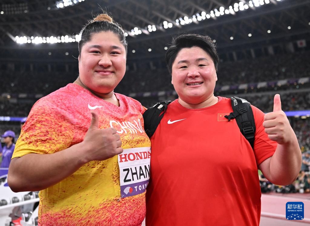 9月20日,中国选手巩立姣(右)和张林茹在赛后合影。