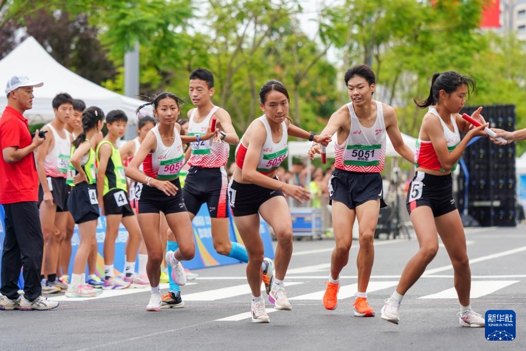 9月20日,参赛选手在混合U16组4x1km接力赛中交接棒。