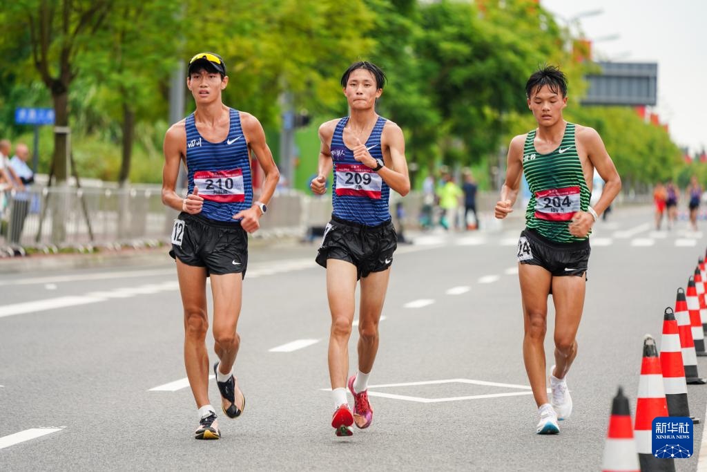 9月20日,江苏国寿选手陆宇杰(右)、四川选手刘耘成(左)和李鑫在男子U18组10公里竞走比赛中。最终,他们分别位列该项目第三、四、五名。