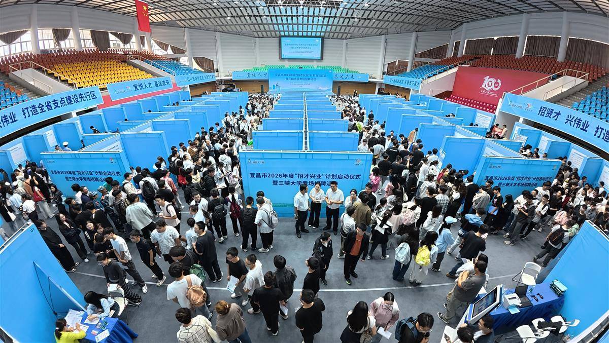 9月 21日上午,宜昌 2026年度“招才兴业”计划启动仪式暨三峡大学专场招聘活动在三峡大学大学生体育馆隆重举行。这场汇集政企校多方力量的人才盛会,以“政策精准供给+产业需求匹配”为核心,现场发布10,000个优质岗位及100个海内外高层次人才精英岗位,同步推出系列人才新政与服务举措,彰显宜昌打造长江经济带人才高地的决心。参会单位涵盖湖北三峡实验室、兴发集团、安琪酵母等科研机构及龙头企业,形成“基础研究+应用开发+产业转化”的全链条人才需求矩阵。现场设置的求职招聘、职业指导等四大功能区,为3000余名参会学子提供“一站式”服务。(湖北日报全媒记者 刘曙松 摄)