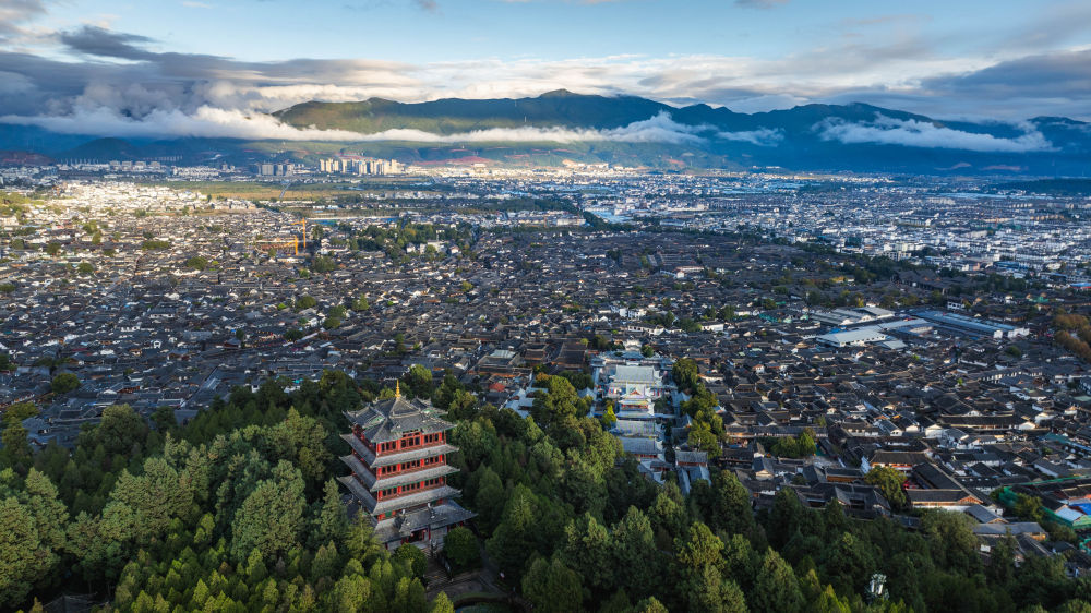 这是2024年11月8日拍摄的丽江古城日落风光(无人机照片)。新华社记者 胡超 摄