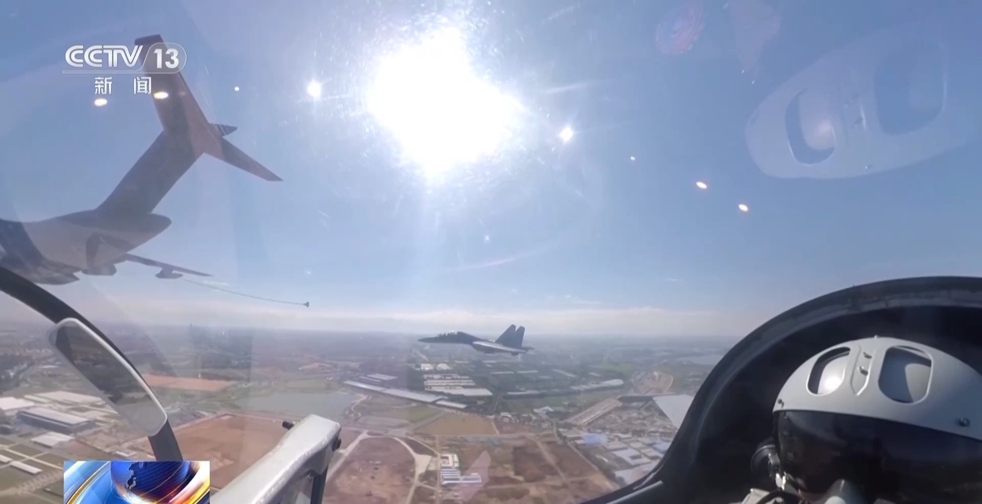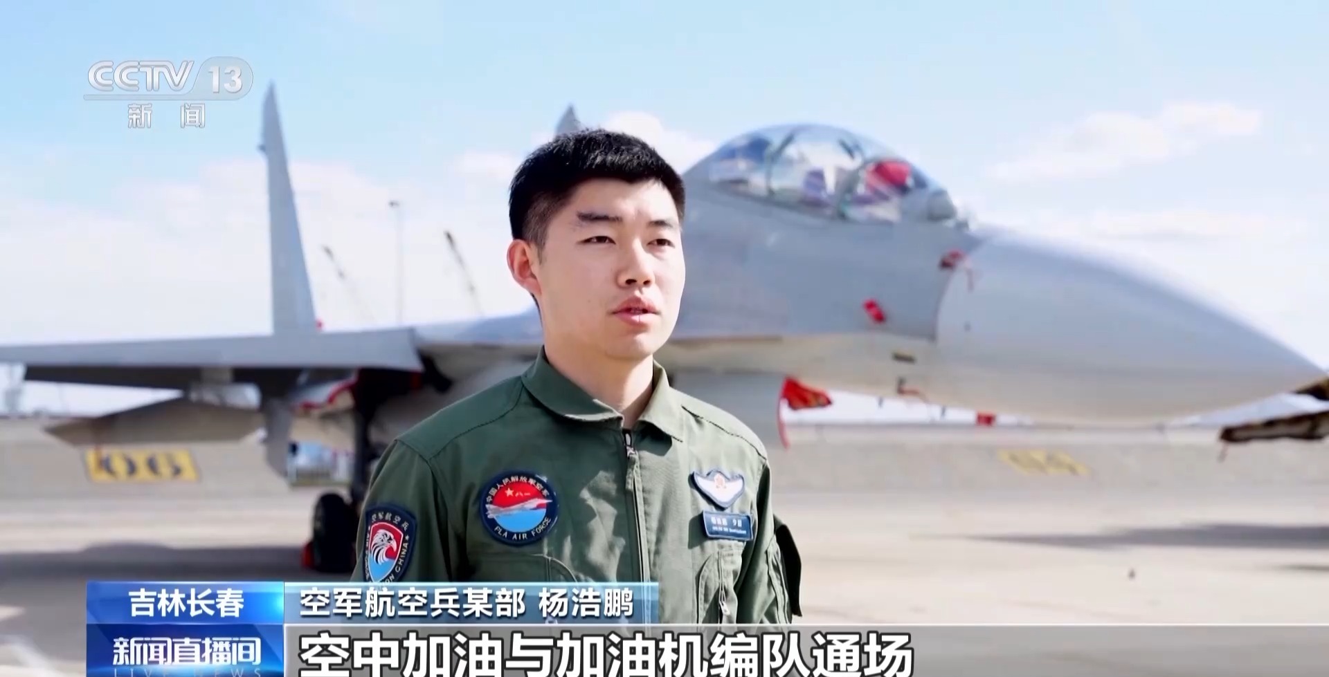 空军航空兵某部 杨浩鹏:空中加油与加油机编队通场,相当于把我们平时的训练搬到了现场。通过空中加油来增大歼-16的续航能力和作战半径。