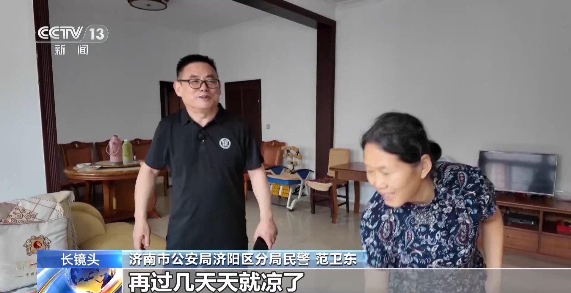 济南市公安局济阳区分局民警 范卫东:我又给大妈拿了件冬天的薄羽绒服,再过几天天就凉了。
